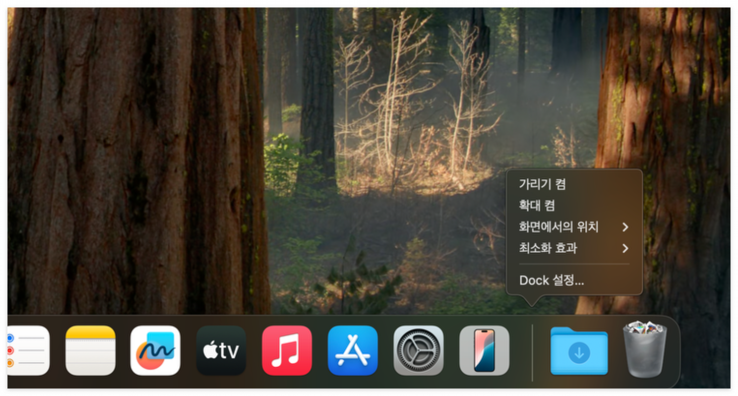 Dock은 macOS 하단에 위치한 앱 실행 바입니다. 자주 사용하는 앱을 고정하거나, 실행 중인 앱을 확인할 수 있습니다.