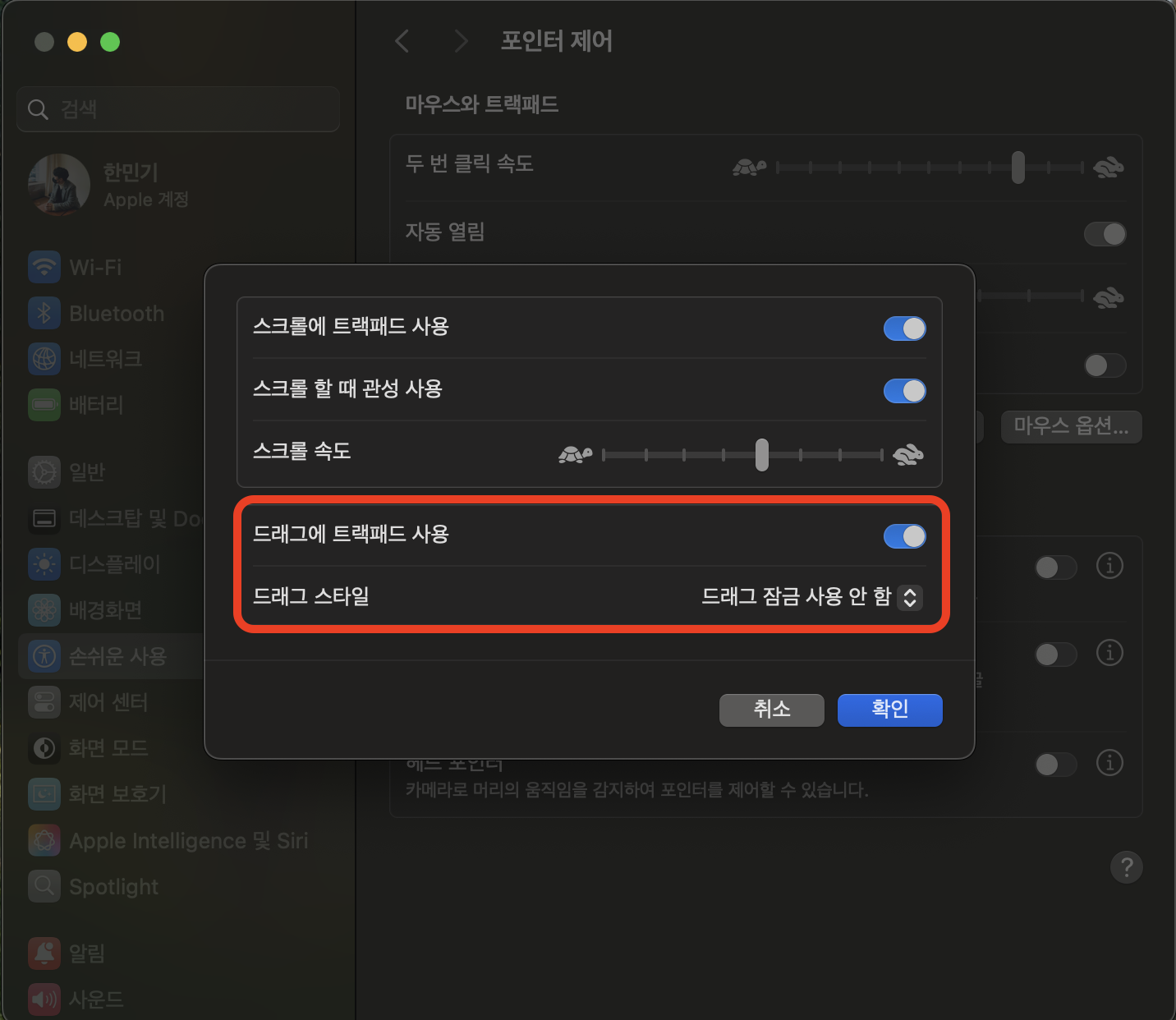 시스템 설정 > 손쉬운 사용 > 포인터 제어 > 트랙패드 옵션 > 드래그 스타일: "세 손가락으로 드래그" or 드래그 잠금 사용 안함
