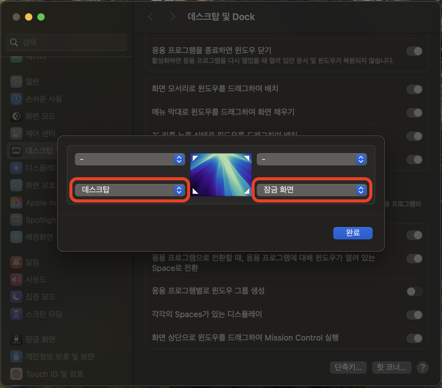 시스템 설정 > 데스크탑 및 Dock > 화면 하단 → "핫 코너" - 추천 조합 예시: