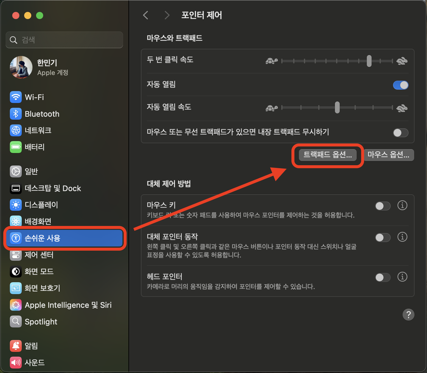 🖐 4. 트랙패드 설정 – 드래그/탭으로 클릭 필수