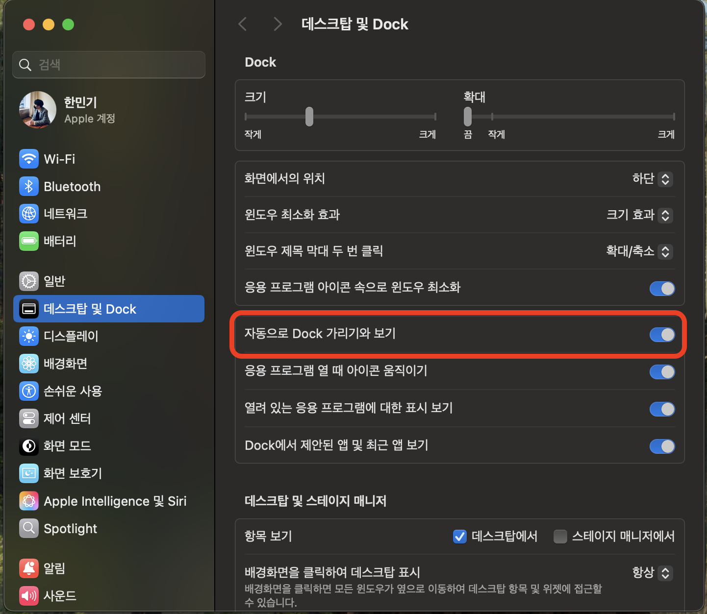시스템 설정 > 데스크탑 및 Dock > Dock 자동으로 가리기 활성화 - 이유: