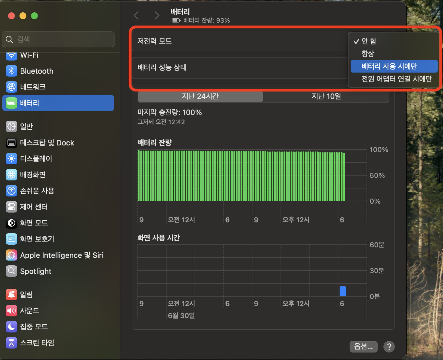 - 저전력 모드 사용 (배터리 사용 시에만)